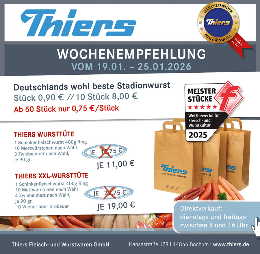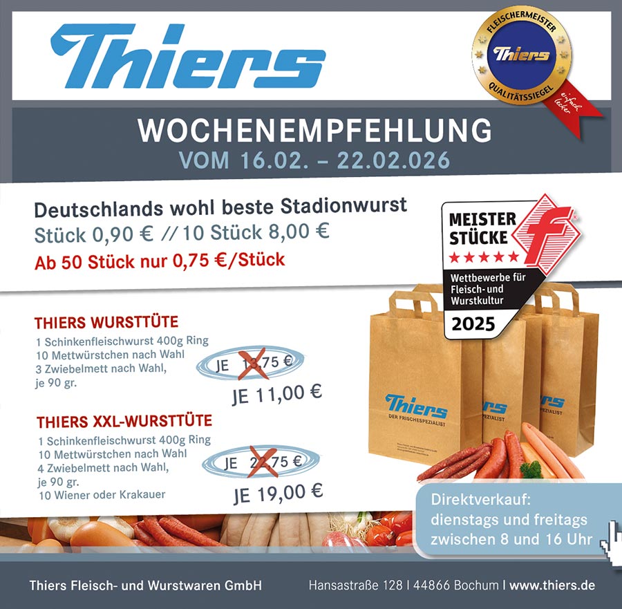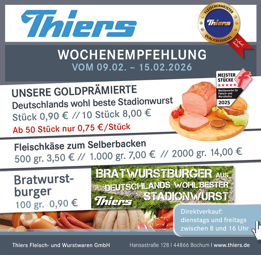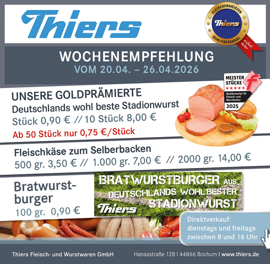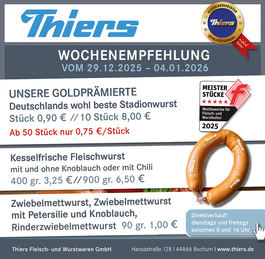 Mit Gold dekoriert wurde unsere Rostbratwurst, bekannter als Deutschlands wohl beste Stadionwurst. Sie darf auf keinem Grill fehlen und schmeckt am besten direkt vom Grillrost in den Mund. Die Thiers Rostbratwurst wird nach einem traditionellen Familienrezept ausschließlich aus Schweinefleisch hergestellt. Viele Vereine aus der Region verwöhnen ihre Fans bereits mit Deutschlands wohl bester Stadionwurst.